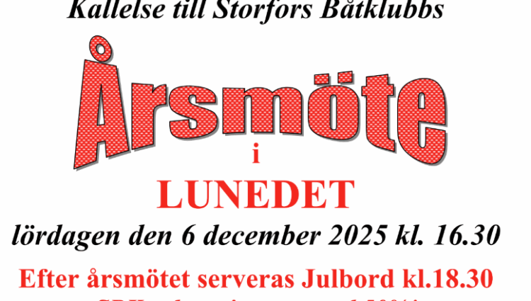 Publicerat 2025-11-10Välkommen på Storfors Båtklubbs årsmöte. Det går av stapeln i Lunedet den 6:e december 2025. Vi startar mötet kl 16.30.